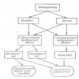 принципов: эффекта Холла, МДП - структур, электрохимических явлений и др. Следует отметить, что ни один из видов потенциометров не может полностью заменить другой, так как каждый из них имеет свои достоинства и недостатки, а следовательно, и свою область применения. Проволочные потенциометры — исторически наиболее ранний вид, технология их изготовления хорошо освоена, в нашей стране они наиболее широко распространены. Другие виды потенциометров разработаны и разрабатываются с целью устранения некоторых недостатков проволочных потенциометров и расширения области применения потенциометров. Однако разработка новых видов потенциометров не привела к сокращению производства проволочных потенциометров. Ситуация здесь подобна той, которая имеет место в производстве электромеханических реле. Несмотря на разработку и освоение массового выпуска транзисторов, тиристоров, динисторов и других бесконтактных переключающих устройств, выпуск электромеханических реле не только не сокращается, но из года в год увеличивается. Областями применения проволочных потенциометров являются и, по-видимому, останутся наиболее точные и высокостабильные системы, работающие в среднем диапазоне рабочих температур. В менее точных системах проволочные потенциометры могут быть вытеснены и вытесняются пластиковыми. При высоких температурах успешно применяют пленочные потенциометры. Областями применения фотопотенциометров являются маломощные системы относительно невысокой точности с высокой износоустойчивостью, а также специальные системы со световым входным сигналом. Применение других видов потенциометров определяется по мере освоения и выявления всех их достоинств и недостатков. В настоящей брошюре основное внимание уделяется проволочным потенциометрам, так как они наиболее широко применяются, По другим видам потенциометров приводятся только краткие сведения общего характера. По виду функциональной характеристики потенциометры разделяют на линейные и функциональные. По конструктивному исполнению потенциометры разделяют на: - одинарные и блочные (многоэлементные); - с вращательным и с поступательным перемещением подвижного контакта; - однооборотные, многооборотные и стержневые; - с неограниченным и ограниченным рабочим углом. Данная классификация потенциометров приведена на рис.8. Одинарный потенциометр имеет один резистивный элемент и одну токосъемную систему, блочные - несколько резистивных элементов (однооборотные до десяти, многооборотные до пяти). Многоэлементные потенциометры выполняют в виде отдельных элементов (модулей), нужное число которых собирается в блок потребителем, или в виде собранного на заводе-изготовителе блока, который не подлежит разборке на отдельные элементы. Многоэлементные потенциометры, собираемые в блоки потребителем, особенно удобны при выполнении исследовательских и экспериментальных работ на стадии разработки системы. Блочные потенциометры, более точные и надежные, предпочтительнее для серийно изготовляемых систем. Потенциометры с вращательным перемещением подвижной системы могут быть одно - и многооборотными, потенциометры с поступательным перемещением движка - стержневые. Однооборотные потенциометры имеют кольцевой резистивный элемент, по которому перемещается один или неско