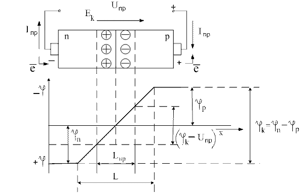 На рис. 2.8 контактная разность потенциалов jк = jn - jp, вектор напряженности электрического поля Ек, толщина p-n-перехода L. Высота потенциального барьера на p-n-переходе определяется контактной разностью потенциалов jк, которая в свою очередь зависит от концентрации примесей в этих областях: