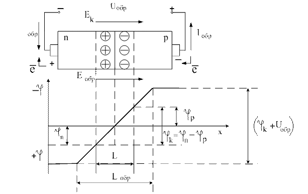 Сначала возникает переходный процесс, связанный с движением основных носителей, которые удаляются от ЭДП. У отрицательного электрода дырки рекомбинируются электронами, которые приходят из проводника, соединяющего этот электрод с отрицательным полюсом источника. Так как из n-области уходят электроны, она заряжается положительно, p-область заряжается отрицательно, так как ее дырки заполняются приходящими электронами. Толщина запорного слоя увеличивается. Такое движение кратковременно, а ток подобен зарядному току конденсатора. Вся система представляет собой конденсатор с плохим диэлектриком, в котором есть ток утечки (его роль выполняет Iобр). Но ток утечки конденсатора в соответствие с законом Ома пропорционален приложенному напряжению, а обратный ток мало зависит от Uобр. Изменение потенциального барьера, при подаче на него напряжения и изменения ширины ЭДП, часто называют “смещением перехода”.