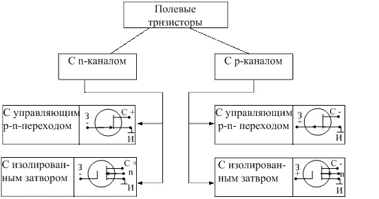 Рис. 6.28. Классификация и условные графические обозначения полевых транзисторов