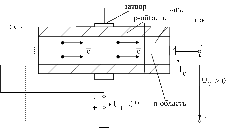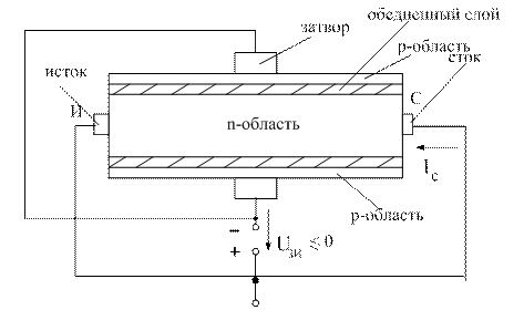 При подаче запирающего напряжения Uзи на p-n-переход между затвором и каналом на границах канала возникает равномерный слой, объединенный носителями зарядов и обладающий высоким удельным сопротивлением, а это приведет к уменьшению проводящей ширины канала. Напряжение, приложенное между стоком и истоком, приводит к появлению неравномерного обедненного слоя, так как разность потенциалов между затвором и каналом увеличивается в направлении от истока к стоку и, наименьшее сечение канала расположено вблизи стока.