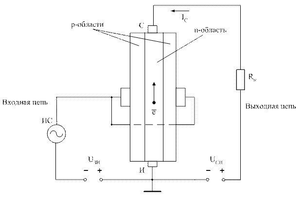 Полевой транзистор с управляемым переходом – это транзистор, у которого затвор электрически отделен от канала закрытым p-n-переходом. В транзисторе с n- каналом (рис. 6.29) основными носителями зарядов в канале являются электроны, которые движутся вдоль канала от истока с низким потенциалом к стоку с более высоким потенциалом, образуя ток стока Iс. Между затвором и истоком приложено напряжение, запирающее p-n-переход. Полярность приложенных напряжений должна быть следующая: Uси>0, Uзи£0.