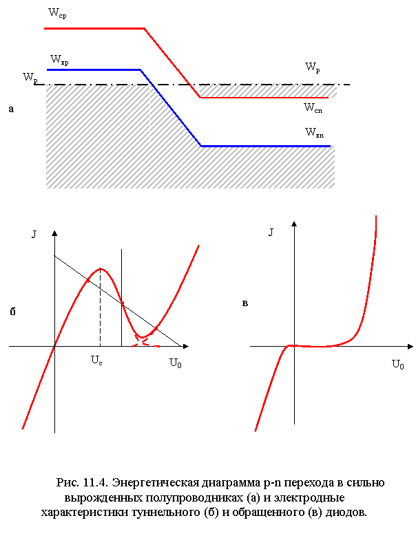 Туннельным диодом называется диод на основе вырожденных полупроводников, в котором из-за перекрытия зон туннельный эффект приводит к появлению на электродной характеристике при прямом включении участка с отрицательным дифференциальным сопротивлением. Энергетическая диаграмма p-n перехода в вырожденных полупроводниках и электродная характеристика приведены на рис. 11.4. Степень вырождения полупроводников такова, что уровни Ферми лежат в разрешенных зонах и в состоянии термодинамического равновесия дно зоны проводимости n-полупроводника лежит ниже потолка валентной зоны р-полупроводника. Так как ширина перехода очень мала, то обмен электронами в состоянии равновесия происходит главным образом за счет их туннелирования сквозь потенциальный барьер. При малых значениях прямого напряжения, когда дно зоны проводимости n-полупроводника смещается вверх, число туннельных переходов электронов из n-полупроводника в р-полупроводник возрастает и становится больше числа таких же переходов в состоянии равновесия. Число обратных туннельных переходов при этом, напротив, уменьшается. В результате возникает прямой туннельный ток диода, возрастающий с ростом приложенного напряжения. Это возрастание, однако, имеет место лишь до тех пор, пока квазиуровень Ферми n-полупроводника не поднимется до уровня потолка валентной зоны р-полупроводника. Дальнейшее увеличение прямого напряжения приведет к тому, что все большая часть заполненных уровней зоны проводимости n-полупроводника будет приходиться против запрещенной зоны р-полупроводника, куда туннелирование невозможно. Прямой туннельный ток станет уменьшаться. Так как ток надбарьерной инжекции электронов при этих напряжениях еще мал, то уменьшение туннельного тока буде означать и уменьшение полного тока. Когда прямое напряжение достигает значений, при которых становится существенной надбарьерная инжекция, полный ток вновь начинает возрастать. При обратном включении диода превалируют туннельные переходы электронов из р-полупроводника в n-полупроводник (образование электронно-дырочных пар). Ток непрерывно нарастает с ростом обратного напряжения.