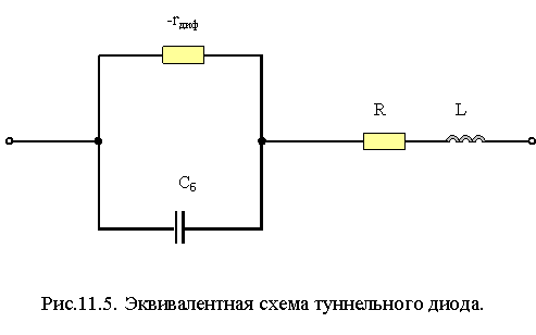 Наличие участка характеристики с отрицательным дифференциальным сопротивлением является той особенностью туннельных диодов, которая позволяет использовать их в качестве усилителей и генераторов электрических колебаний высоких и сверхвысоких частот, а также в схемах сверхвысокоскоростного переключения (цифровые или логические схемы). Изготавливаются туннельные диоды из германия или арсенида галлия. Германиевые диоды имеют меньший уровень собственных шумов, что важно при их использовании в качестве усилителей. Диоды из арсенида галлия обладают большим значением напряжения Uс, соответствующего максимуму туннельного тока (~1В, вместо ~0,4В для германия), поэтому им отдается предпочтение при использовании в цифровых схемах и генераторах. Высокое быстродействие туннельных диодов обусловлено тем, что сам туннельный эффект безинерционен и развитие процесса определяется временем релаксации электрического поля в полупроводнике t=re0e, которое составляет величину порядка 10-12…10-13с. Таким образом, реально, инерционность диода будет обусловливаться только наличием барьерной емкости и индуктивности выводов L, которая становится существенной на сверхвысоких частотах. Предельную частоту можно определить, опираясь на эквивалентную схему туннельного диода, представленную на рис.11.5.На этой схеме R-сопротивление потерь в полупроводнике. Полное сопротивление диода в режиме отрицательного дифференциального сопротивления равно