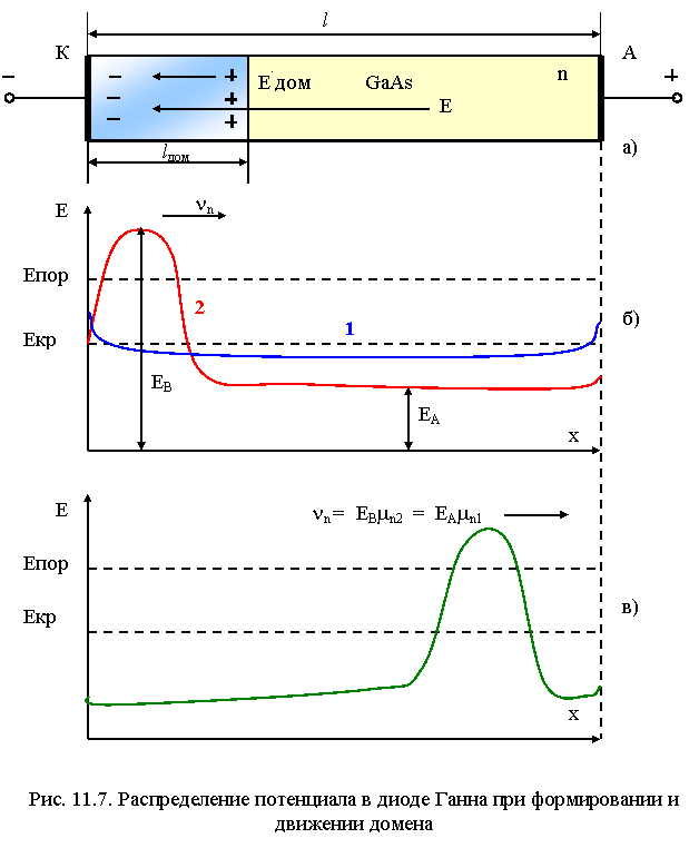 При увеличении напряженности электрического поля Переход из одного состояния к другому изображается на характеристике (рис. 11.6 (а)), падающим участком ab, в пределах которого диод обладает отрицательным дифференциальным сопротивлением. В работающем диоде к пластине кристалла с хорошими омическими контактами прикладывается напряжение (плюс к аноду, минус к катоду – рис. 11.7(а)), создающее напряженность электрического поля чуть меньше критической. Поэтому в начальный момент в кристалле возникает ток с плотностью, чуть меньшей ja (рис.11.6 (а)), определяемый электронами с большой подвижностью mn1.