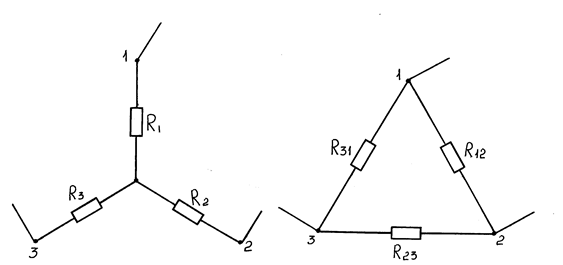 Это преобразование должно быть эквивалентным, т.е. сопротивления между точками цепи 1 и 2, 2 и 3, 3 и 1 должны быть соответственно одинаковыми в обоих видах соединении.