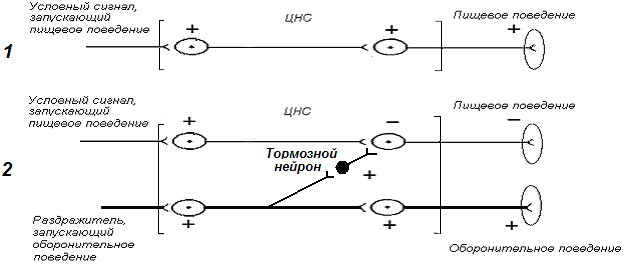 Рис. 5. Схема, иллюстрирующая механизм внешнего (безусловного) торможения (описание с тексте) Что такое внутреннее, или условное, торможение условных рефлексов Это разновидность торможения, т. е. угнетения выраженности условных рефлексов, когда условный сигнал перестает подкрепляться безусловным раздражителем. Фактически при отмене подкрепления у подопытного животного вырабатывается новый поведенческий навык, проявляющийся в том, что при действии условного сигнала ранее имевшая место поведенческая реакция не запускается из-за выработки отрицательного, или тормозного, условного рефлекса (И. П. Павлов). Именно поэтому И. П. Павлов назвал данную разновидность торможения, в отличие от безусловного торможения, условным торможением, которое обнаруживается лишь при определенных условиях. Второе название данного вида торможения – внутреннее торможение подчеркивает его связь с внутренними механизмами мозга, реализующего адаптивное поведение организма в среде обитания. Какое значение имеет механизм внутреннего (условного) торможения для жизнедеятельности организма? Условное торможение играет исключительную роль в обеспечении приспособительной активности. Это – механизм устранения поведенческой реакции на сигнал, который перестал подкрепляться безусловным раздражителем. Если бы этого механизма не было, организм осуществлял бы большое количество биологически бесполезных поведенческих актов. Назовите основные свойства внутреннего (условного) торможения 1. Условное торможение развивается при неподкреплении условных сигналов безусловным раздражителем. 2. Условное торможение поддается тренировке, что означает облегченную его выработку при повторении опытной ситуации. 3. Способность к выработке условного торможения зависит от индивидуальных свойств нервной системы. Например, у возбудимых индивидуумов условное торможение вырабатывается труднее, чем у спокойных. 4. Более прочные и стабильные условные рефлексы труднее поддаются торможению, чем недавно сформированные условные рефлексы. Охарактеризуйте разновидности внутреннего торможения? Угасательное торможение - развивается при отсутствии подкрепления условного сигнала безусловным. Например, если у собаки условный сигнал, запускающий условную пищевую реакцию, повторять через определенные временные интервалы без пищевого подкрепления, условный пищевой рефлекс с каждым разом будет становится все слабее и слабее вплоть до исчезновения. Скорость выработки угасательного торможения зависит от прочности условного рефлекса более – прочные условные рефлексы угашаются медленнее. Дифференцировочное торможение - развивается при неподкреплении условных сигналов, близких по своим параметрам к подкрепляемому условному сигналу. Например, у подопытной собаки вырабатывается условный рефлекс на тон 1000 гц. Все близкие тоны (800 гц, 1200 гц) при первом своем применении будут также вызывать условную реакцию. Это явление было названо И. П. Павловым генерализацией условных рефлексов. Вместе с тем, постоянно подкрепляя лишь тон 1000 гц и не подкрепляя другие тоны, можно добиться различения, дифференцировки используемых звуковых раздражителей. Она будет проявляться в воспроизведении условной реакции на тон 1000 гц при отсутствии реакций на действие тонов 800 и 1200 гц. Условный торм