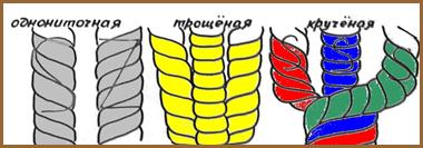 • Однониточная (при раскручивании распадается на волокна); • Трощёная (состоит из двух или трёх нитей не скрученных между собой); • Кручёная (состоит из двух или трёх одиночных нитей, скрученных между собой);