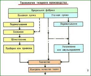 которая выбирается в зависимости от длины и толщины волокон и в последствии определяет толщину пряжи и тканей. • Суровая (не прошедшая отделки); • Отбеленная (прошедшая отбеливание); • Гладкокрашеная (окрашена в определённый цвет); Примечание: для производства суровой, отбеленной, гладкокрашеной х/б тканей и тканей с печатным рисунком применяют суровую пряжу, так как отбеливание и крашение производят непосредственно самих тканей). • Меланжевая (состоящая из разноокрашенных или окрашенных и неокрашенных волокон); Из меланжевых тканей получают меланжевые ткани). • Мулинированная (кручёная пряжа, состоящая из разноокрашенных нитей); Из сочетания отбеленной, гладкокрашеной, мулинированной пряжи вырабатывают пёстротканые ткани).