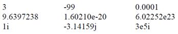 В MATLAB нет необходимости в определении типа переменных или размерности. Когда MATLAB встречает новое имя переменной, он автоматически создает переменную и выделяет соответствующий объем памяти. Если переменная уже существует, MATLAB изменяет ее состав и если что необходимо выделяет дополнительную память. Например, d = 25 создает матрицу 1x1 с именем d и сохраняет значение 25 в ее единственном элементе. Имена переменных состоят из букв, цифр или символов подчеркивания. MATLAB использует только первые 31 символ имени переменной. MATLAB чувствителен к регистрам, он различает заглавные и строчные буквы. Потому А и а не одна и та же переменная. MATLAB использует принятую десятичную систему счисления, с необязательной десятичной точкой и знаками плюс-минус для чисел. Научная система счисления использует букву «е» для определения множителя степени десяти. Мнимые числа используют i или j как суффикс. Некоторые примеры правильных чисел приведены ниже