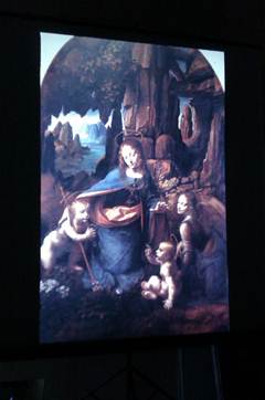 1) впервые Мария посажена на землю, а не на троне Иоан Креститель слева глаз не видно- отстраненность от зрителя дымка сфумато пиромидальная композиция 2) монументализация образов, конкретика, тесно в композиции