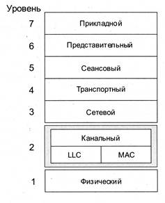 Для того чтобы учесть требования физической передающей среды, используемой в ЛВС, была произведена некоторая модернизация семиуровневой модели взаимодействия открытых систем для локальных вычислительных сетей. Необходимость такой модернизации была вызвана тем, что для организации взаимодействия абонентских ЭВМ в ЛВС используются специальные методы доступа к физической передающей среде. Верхние уровни модели ВОС не претерпели никаких изменений, а канальный уровень был разбит на два подуровня (рис. 10). Подуровень LLC (Logical Link Control) обеспечивает управление логическим звеном, т.е. выполняет функции собственно канального уровня. Подуровень MAC (Media Access Control) обеспечивает управление доступом к среде.