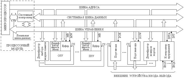 Рис.12.1. Структурная схема микропроцессорной системы с общей шиной. По роду передаваемой информации все шины разделены на три группы, образующие шину данных, шину адреса и шину управления. Характерной особенностью шины данных является ее двунаправленность, обеспечиваемая буферными регистрами, под которой понимается возможность передачи данных в разные моменты времени в различных направлениях, например, сначала от микропроцессора к периферийному модулю, а затем в обратном направлении. Ещё одна особенность этих буферных регистров заключается в том, что они являются трехстабильными, т.е. выходы этих регистров могут принимать третье пассивное, высокоимпедансное состояние, благодаря чему регистр оказывается отключенным от шины данных. Каждый периферийный модуль микропроцессорной системы имеет вход для приема сигнала CS (выбор кристалла). В процессе работы с помощью этого сигнала "активизируется" только один из периферийных модулей. Выходы буферных регистров остальных модулей остаются в высокоимпедансном состоянии. Поскольку микропроцессор должен обмениваться данными с определенными ячейками памяти запоминающих устройств или с определенными портами, то для возможности обращаться (адресоваться) к ним, каждая ячейка памяти и каждый порт ввода или вывода имеют свои индивидуальные номера - адреса. При обмене данными микропроцессор устанавливает двоичный код, соответствующий адресу порта или ячейки памяти на шине адреса. Шина адреса является однонаправленной, т.е. адреса передаются только от микропроцессора. Рассматриваемая микропроцессорная система содержит два модуля памяти: модуль ОЗУ и модуль ПЗУ. В общем случае в системе может содержаться несколько модулей (микросхем) ОЗУ и ПЗУ, каждый из которых имеет вход для приема сигнала CS. Во всех случаях, когда в системе имеется более одного модуля памяти, часть кода адреса ячейки памяти должна указывать, к какому модулю памяти производиться обращение. Эта часть называется кодом выбора модуля. Оставшаяся часть кода адреса выбирает ячейку памяти внутри модуля и называется адресом ячейки внутри модуля. Дешифрация кода выбора модуля производится с помощью дешифратора выбора модуля памяти, который вырабатывает соответствующий сигнал CS. Дешифрация адреса ячейки осуществляется внутренним дешифратором модуля памяти. Входы этого дешифратора (адресные шины модуля памяти) подключаются к соответствующим линиям шины адреса. В рассматриваемой системе содержится один порт ввода и один порт вывода. В общем случае портов ввода-вывода может быть гораздо больше. Поскольку каждый порт представляет собой один регистр, то дешифрация номеров портов осуществляется только внешним дешифратором, формирующим сигнал CS выбора портов. Дополнительным условием «активизации» любого периферийного модуля является наличие соответствующего сигнала на шине управления. По линиям шины управления от микропроцессора к периферийным модулям поступают сигналы, определяющие выбор группы модулей (порты или модули памяти), а также направление обмена данными. Такими сигналами являются: сигнал чтения из модулей запоминающих устройств RDM (read memory); сигнал записи в модули запоминающих устройств WRM (write memory), сигнал чтения из порта ввода RDIO (read input/output), сигнал записи в порт вывода WRIO (write input/output). Например, при запи