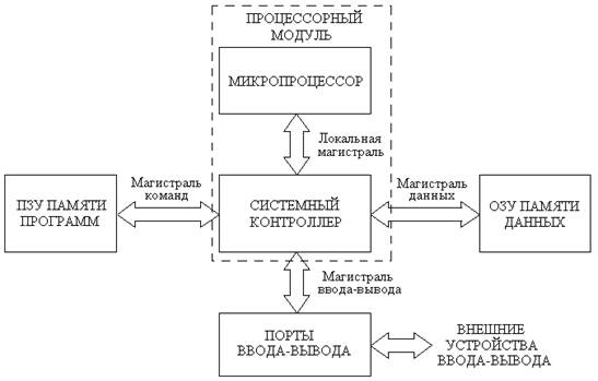 Рис.12.2. Пример структурной схемы микропроцессорной системы с распределенными шинами. Следует отметить, что рассмотренное разбиение составных частей микропроцессорной системы на модули носит функциональный характер, а не конструктивный. В настоящее время часто все компонетнты микропроцессорных систем реализуются в едином кристалле микросхемы. Такие микросхемы называются микроконтроллерами. Использование микроконтроллеров позволяет значительно упростить разработку микропроцессорной измерительной системы, поскольку все необходимые компоненты такой системы, а именно АЦП, ЦАП, интерфейсные узлы, модуляторы, демодуляторы и многие другие, уже содержатся в кристалле микроконтроллера. Еще более гибкой и более сложной в аппаратной реализации является радиально-магитсральная структура. В тех связях периферии с микропроцессором, где необходима высокая скорость обмена информацией, используется радиальный принцип, а где высокая скорость не нужна – магистральный. Примером может служить структура персонального компьютера. По магистральному принципу в нем строится шина PCI (шина периферийных устройств), а по радиальному – шины подсистемы памяти и видеосистемы. В специализированных измерительных микропроцессорных системах такая организация используется редко, поскольку она является сложной и дорогой для сравнительно медленных задач.