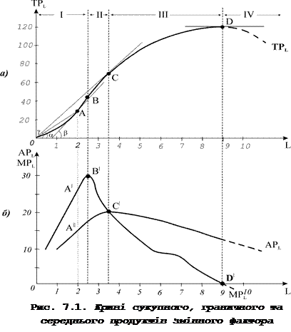 Сукупний фізичний продукт або сумарна продуктивність змінного фактора Граничний фізичний продукт або гранична продуктивність змінного фактора Середній фізичний продукт або середня продуктивність змінного фактора Припустимо, що фірма нарощує обсяги виробництва Конфігурація кривої сукупного продукту (рис.7.1 а) ілюструє нерівномірність приростів випуску продукції. Початкова опуклість функції донизу показує, що до точки Найбільш виразно ці закони відображає крива граничного продукту праці Крива середнього продукту Всі криві взаємопов’язані. За кривою сукупної продуктивності Для аналізу ефективності використання ресурсів враховують таку властивість показників: якщо гранична продуктивність вища за середню, то нарощування змінного фактора супроводжується зростанням продуктивності (крива Якщо врахувати динаміку всіх показників продуктивності за умови нарощування використання змінного фактора, то можна виділити чотири стадії розвитку виробництва: § на першій стадії всі показники зростають, всі криві є висхідними до точок § на другій стадії гранична продуктивність і крива § на третій стадії зростає лише сукупний продукт § на четвертій – спадають всі показники (праворуч від точок Закон спадної віддачі, як правило, діє в межах певної технології, тобто у короткостроковому періоді. Спадна продуктивність змінного фактора визначає динаміку короткострокових витрат виробництва.