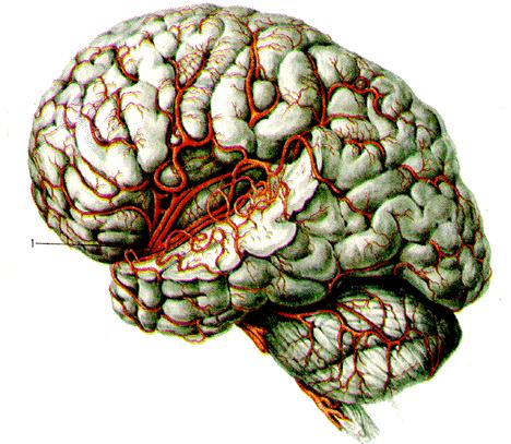 Артериальное кровоснабжение осуществляется из двух источников: передние отделы мозга снабжаются кровью через внутренние сонные артерии, а задние - через две позвоночные артерии, которые, сливаясь у основания продолговатого мозга, образуют основную артерию, которая в свою очередь заканчивается двумя задними мозговыми артериями. Системы внутренних сонных и основной артерий объединяются посредством двух задних соединительных артерий на нижней поверхности мозга. Каждая внутренняя сонная артерия делится на три основные ветви: переднюю, среднюю артерии большого мозга (ее проксимальный ствол - задняя соединительная артерия), а также переднюю артерию сосудистого сплетения. Обе передние артерии соединяются посредством передней соединительной артерии, завершающей формирование артериального круга большого мозга. От каждого из трех основных сосудов отходят перфорирующие артерии, идущие к глубоким подкорковым ядрам, а затем образующие сеть, которая дает начало другим перфорирующим артериям, снабжающим кору мозга. Мелкие ветви перфорирующих артерий выполняют в отношении отдельных нейронных групп функцию “конечных артерий”: закупорка одного из таких сосудов приводит к гибели нейронов в снабжаемой им области. Однако закупорка по крайней мере некоторых ветвей поверхностной артериальной сети не всегда сопровождается серьезными корковыми поражениями в силу хорошего развития системы коллатеральных анастомозов. Артериальное кровоснабжение спинного мозга осуществляется передней и задней спинномозговыми артериями, которые отходят от позвоночной артерии. Отходящие от них перфорирующие сосуды снабжают кровью серое вещество мозга. Венозный отток от передних отделов мозга идет в систему поверхностных и глубоких вен. Поверхностная система состоит из вен, отводящих кровь от коры головного мозга и вливающихся в синусы твердой мозговой оболочки: верхний сагиттальный, поперечный и пещеристый. Система глубокого венозного оттока состоит из двух групп сосудов: вены, расположенные выше и ниже промежуточного мозга и базальных ядер. Вены расположенные более дорсально, соединяются в парные внутренние вены большого мозга. Под валиком мозолистого тела эти вены сливаются, образуя большую вену мозга (вена Галена), которая вливается в прямой синус. Вены основания мозга сливаются в основную вену. По ходу в нее вливаются вены, отводящие кровь от промежуточного мозга и области покрышки среднего мозга.