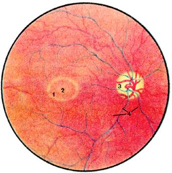 Соответственно функции выделяют большую заднюю зрительную часть сетчатки, содержащую чувствительные элементы (фоторецепторы) – палочки (около 120 млн.) и колбочки (около 6 млн.), и меньшую - "слепую" часть сетчатки, лишенную палочек и колбочек. "Слепая" часть сетчатки объединяет ресничную часть и радужковую часть сетчатки. Границей между зрительной и "слепой" частями является хорошо видимый на препарате вскрытого глазного яблока зубчатый край. Он соответствует месту перехода собственно сосудистой оболочки в ресничный кружок сосудистой оболочки. Также в сетчатке есть глиальные клети (мюллеровские клетки) и пигментные клетки. Фоторецепторы соединены синаптическими контактами с биполярными и горизонтальными клетками. Биполяры передают сигналы от фоторецепторов в слой амакриновых и ганглиозных клеток. Аксоны ганглиозных клеток, граничащих со стекловидным телом, направляются к оптическому диску, или слепому пятну, где они собираются вместе, проходят через склеру и образуют зрительный нерв. В месте пересечения сетчатки оптической осью находится углубление (фовеа), которое содержит из фоторецепторов только колбочки. В заднем отделе сетчатки на дне глазного яблока можно видеть беловатого цвета пятно диаметром около 1,7 мм - диск зрительного нерва, с приподнятыми в виде валика краями и небольшим углублением (рис. 12.3). Диск является местом выхода из глазного яблока волокон зрительного нерва, образующий наружное и внутреннее влагалища зрительного нерва, который направляется в сторону зрительного канала, открывающегося в полость черепа. Вследствие отсутствия светочувствительных зрительных клеток (палочек и колбочек) область диска называют слепым пятном. В центре диска видна входящая в сетчатку ее центральная артерия. Латеральнее диска зрительного нерва примерно на 4 мм, что соответствует заднему полюсу глаза, находится желтоватого цвета пятно с небольшим углублением - центральной ямкой.