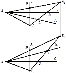 Показати як проблемну ситуацію: Зауважимо, що для площин окремого положення одна з ліній рівня перетворюється в проецюючу. 4. Позиційні задачі. Позиційні задачі – це задачі на взаємне розташування, взаємну належність, перетин геометричних об¢єктів, а саме: двох прямих, прямої і площини, двох площин тощо. 4.1. Пряма і площина. Можливі варіанти взаємного розташування прямої і площини: - пряма може належати площини – умови приналежності були розглянуті раніше; - пряма може бути паралельна площині; - пряма може перетинати площину. Умова паралельності прямої і площини: Пряма рівнобіжна площини, якщо вона рівнобіжна якийсь прямої, що лежить у цій площині.