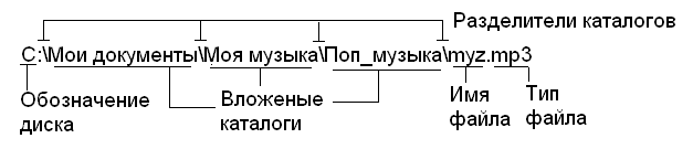 Каталоги (папки) — важные элементы иерархической структуры, необходимые для обеспечения удобного доступа к файлам, если файлов на носителе слишком много. Файлы объединяются в каталоги по любому общему признаку (по типу, по принадлежности, по назначению, по времени создания и т. п.). Каталоги низких уровней вкладываются в каталоги более высоких уровней и являются для них вложенными. Верхним уровнем вложенности иерархической структуры является корневой каталог диска. Все современные операционные системы позволяют создавать каталоги. Правила присвоения имени каталогу ничем не отличаются от правил присвоения имени файлу, хотя негласно для каталогов не принято задавать расширения имен. Мы знаем, что в иерархических структурах данных адрес объекта задается маршрутом (путем доступа), ведущим от вершины структуры к объекту. При записи пути доступа к файлу, проходящего через систему вложенных каталогов, все промежуточные каталоги разделяются между собой определенным символом. Во многих операционных системах в качестве такого символа используется "\" (обратная косая черта), например: