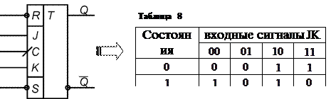12.2 Выбор элементов памяти автомата Замена таблиц переходов ЦА на структурную таблицу переходов приводит к тому, что функция переходов При каноническом методе структурного синтеза автоматов в качестве элементов памяти используются элементарные автоматы Мура с двумя состояниями, обладающие полной системой переходов и выходов. Полнота системы переходов-выходов для любой пары состояний ЦА существует входной сигнал, переводящий ЦА из одного состояния в другое. Полнота системы выходов – различным состояниям автомата соответствуют различные выходные сигналы; обычно нулевому состоянию Число элементов памяти структурного автомата равно числу компонент вектора его состояний. В качестве элементов памяти структурного автомата обычно используются D -, T -, RS - и JK - триггеры, удовлетворяющие требованиям относительно полноты переходов и выходов. Каждый из приведенных триггеров является автоматом Мура. Входы D, T, RS и JK называются информационными. Таблицы переходов триггеров составляются только для информационных входов. Остальные входы являются вспомогательными (C, R, S). Каждый триггер имеет два выхода