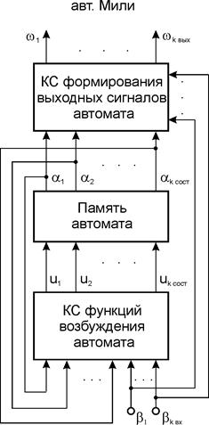 Функционирование структурного автомата во времени предполагает управление переключением каждого элемента автомата памяти в соответствии со структурной таблицей переходов синтезируемого автомата. Последнее выполняется в соответствии помощью специальной комбинационной схемы, подключаемой к информационным входам элементарного автомата памяти и реализующей булевы функции, управляющие его переключением. Такие булевы функции называют функциями возбуждения элемента памяти, и, в общем случае, различных функций возбуждения столько, сколько различных информационных входов имеется у элементарных автоматов памяти в синтезируемом структурном автомате. Функция возбуждения любого элемента памяти является произвольной булевой функцией и для ее реализаций с помощью комбинационных схем необходимо использовать какую-нибудь функционально-полную систему логических элементов. Т.о. для построения структурного автомата, необходимо кроме элементов памяти иметь КС, реализующую булеву функцию возбуждения элементов памяти автомата, а для выработки выходных сигналов структурного автомата – специальные КС формирования выходных сигналов автомата. Если векторная функция переходов