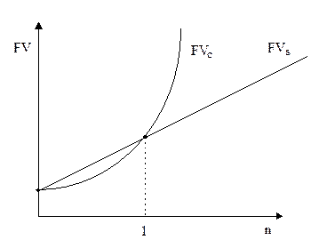 Очень важно помнить, что - при 0 < n < 1 - при n = 1 - при n > 1 Графически взаимосвязь простой и сложной схемы начисления процентов представлена на рис.3.2. Таким образом, в случае ежегодного начисления процентов, для лица, предоставляющего кредит: выгодной является схема простых процентов, если срок ссуды менее одного года (проценты начисляются однократно в конце периода); более выгодной является схема сложных процентов, если срок ссуды превышает один год (проценты начисляются ежегодно); обе схемы дают одинаковые результаты при продолжительности периода в один год и однократном начислении процентов (рис.2).