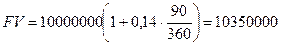 Организация хочет приобрести телекоммуникационное оборудование за 10 млн. руб. Производитель согласен предоставить ссуду на 90 дней, при условии, что организация заплатит за это 14 процентов годовых. Определить выплату?