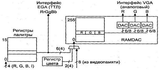 Видеопамять — это специальная область памяти, из которой контроллер ЭЛТ организует циклическое чтение содержимого для регенерации изображения. Определяется необходимым графическим режимом. Контроллер атрибутов управляет цветовой информации, хранящейся в видеопамяти. В текстовом режиме он обрабатывает информацию из байт атрибутов знакомест (откуда и пошло его название), в графическом — из бит текущего выводимого пиксела. Контроллер атрибутов позволяет увязать объем хранимой цветовой информации с возможностями монитора.