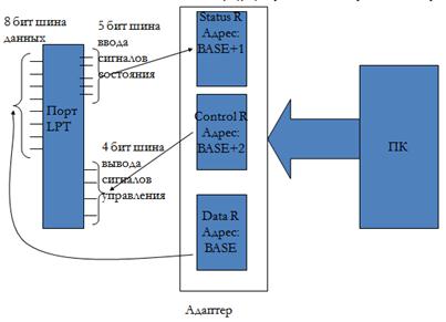 Порт параллельного интерфейса был введен в ПК для подключения принтера -отсюда и пошло его название LPT-порт (Line PrinTer — построчный принтер). Аппаратные средства «классического» стандартного LPT-порта позволяют программным способом реализовать протокол передачи данных Centronics. Адаптер параллельного интерфейса представляет собой набор регистров, расположенных в пространстве ввода-вывода. Регистры порта адресуются относительно базового адреса порта, стандартными значениями которого являются 3BCh, 378h и 278h. Порт может использовать линию запроса аппаратного прерывания, обычно IRQ7 или IRQ5. С внешней стороны порт имеет 8-битную шину данных, 5-битную шину сигналов состояния и 4-битную шину управляющих сигналов, выведенные на разъем-розетку DB-25S. В LPT-пopт используются логические уровни ТТЛ, что ограничивает допустимую длину кабеля из-за невысокой помехозащищенности ТТЛ-интерфейса. Гальваническая развязка отсутствует — схемная земля подключаемого устройства соединяется со схемной землей компьютера. Data Register (DR) — регистр данных, aдpec=BASE. Данные, записанные в этот регистр, выводятся на выходные линии интерфейса. Status Register (SR) — регистр состояния; представляет собой 5-битный порт ввода сигналов состояния принтера (биты SR.4-SR.7), адрес=ВАSЕ+1. Control Register (CR) — регистр управления, адрес=ВАSЕ+2. Как и регистр данных, этот 4-битный порт вывода допускает запись и чтение.