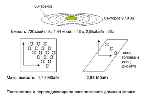 Принцип записи и считывания магнитных дискет на 5” контроль оборотов осуществляется световым индексом, на 3,5’’ магнитным индексом. Намагниченность дискеты определяется положением элементных доменов в каждой зоне своего сектора. Для увеличения емкости дискеты используют перпендикулярную или вертикальную запись, такое расположение доменов требует специальных головок и специальных дискет, такой тип записи не получил распространения.