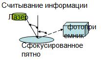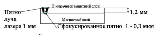 Запись осуществляется термомагнитным способом. Магнитное поле головки способно перемагнитить только микроскопическую зону, разогретую лазерным лучом до температуры выше точки Кюри (200оС). Зона, вышедшая из под луча, запоминает полученное состояние намагниченности. Мощность лазера при считывании уменьшается В магнитооптике используют двухпроходную - трехпроходную запись: 1 –й проход диска под головкой: Сектор стирают. Головка создает постоянное магнитное поле, а лазер включается на полную мощность при проходе под ним сектора(ов). В результате все засвеченные области данных переводятся в одно и тоже состояние намагниченности. 2-й проход под головкой: Непосредственное выполнение записи. Для этого при записи 1 направление магнитного поля меняется на противоположное и над этими точками формируется мощный импульс лазера. 3-й проход под головкой: Проверяется считывание записанной информации – верификация. Размер сектора МОД может быть стандартным (512байт), а может быть и увеличенным (2048 байт). При больших секторах записи снижается доля служебной информации. Количество секторов на треке – переменно и здесь применяется зонная запись. При этом в каждой зоне имеются служебные и резервные области, позволяющие переназначать сектора для пользователя. Магнитоптические диски имеют следующие размеры: 5,25” (двухсторонние) - 650 Мб; 1,3, 2,6, 4,6 Гб; 3,5”(односторонние) – 128, 230, 540, 640 Мб; 1,3 Гб. Устройства и диски обладают обратной совместимостью: устройства большой емкости могут работать с устройствами малой емкости. Форматирование выполняется специальной утилитой, входящей в комплект драйверов устройства. Низкоуровневое форматирование производится в процессе производства, которое в дальнейшем может выполнить и пользователь. При низкоуровневом форматировании задается размер сектора. Форматирование верхнего уровня выполняется под конкретную файловую систему и может выполнятся на уровне дискет или на уровне винчестера. В первом случае диск представляется в виде большой дискеты и в его нулевом логическом блоке содержится загрузчик без таблицы носителя. Дискета подразумевает сменяемость, но работает с драйвером уже загруженной операционной системы. Во втором случае диск начинается с таблицы разделов и для системы выглядит как жесткий диск, который может обслуживаться BIOS без всяких загружаемых драйверов и без учета смены носителя. Поэтому некорректная смена носителя может привести к потери данных, когда после смены носителя ОС не обновляет таблицы размещения файлов.
