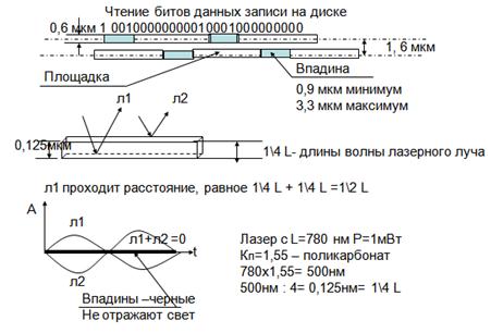 При записи лазер прожигает информационный слой и делает впадину. При считывании информации на границе ямок и площадок производится единичный бит. Принцип записи информации, информация записывается в сессиях. Каждая сессия имеет 99 треков.