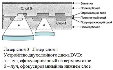 Двухслойные диски DVD. Отличие от CD: - Ширина трека и продольный размер битовой ячейки уменьшается в 2 раза - Убраны коррекции ячеек избыточности кода - Информация может храниться на 2-х слоях - Используются 2 стороны диска - Для считывания измеряется длина волны лазера 650 нм - Изменена система начального кодирования, используется 16-битовые коды