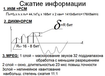 коэффициент нелинейных искажений (к.н.и.), который определяется как отношение мощности гармоник выходного сигнала к мощности основного тона. Для оцифровки аналогового сигнала применяется дискретизация по времени и квантование по уровню. Это означает, что регулярно с частотой дискретизации производятся выборки мгновенного значения аналогового сигнала. Эти выборки квантуются при помощи аналогово-цифрового преобразователя АЦП. На выходе АЦП информация представляется в виде двоичного кода — то есть числом, которое может принимать одно из множества дискретных значений, определяемых разрядностью преобразователя. Очевидно, чем выше разрядность, тем точнее это число может представлять мгновенное значение аналогового сигнала. Простейший способ цифрового представления сигналов называется импульсно-кодовой модуляцией (ИКМ). Поток данных ИКМ представляет собой последовательность мгновенных значений или выборок в двоичном коде. Если применяемые преобразователи имеют линейную характеристику (мгновенное значение напряжения сигнала пропорционально коду), то данная модуляция называется линейной. Для реальных звуковых сигналов кодирование с линейной ИКМ является неэкономичным. Поток данных можно сократить, если использовать несложный алгоритм сжатия, применяемый в системе дельта-ИКМ (ДИКМ). Упрощенно этот алгоритм выглядит так: в цифровом потоке передаются не сами мгновенные отсчеты, а масштабированная разность реального отсчета и его значения, сконструированного кодеком по ранее сгенерированному им потоку данных. Разность передается с меньшим числом разрядов, чем сами отсчеты. Более сложные алгоритмы и высокая степень сжатия применяются в аудио- -кодеках MPEG: 1 слой – маскировка звуков 32 под диапазон обработанного с меньшим разрешением 2 слой – окно, длительностью 32мкс повышенной точности 3 слой – нелинейное квантование. Наибольшая степень сжатия информации 11:1