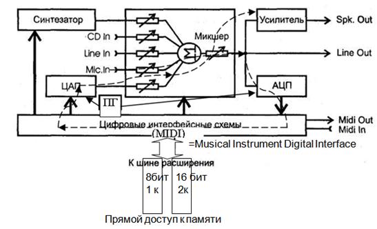 Аналоговые сигналы от различных источников — микрофона, CD (здесь обычно используется аналоговый интерфейс CD-ROM), линейного входа, а также ЦАП и синтезатора — смешиваются микшером. Микшер для каждого входа имеет аналоговые регуляторы с цифровым управлением, позволяющие изменять усиление и баланс стереоканалов. Микшер может быть дополнен регулятором тембра — простейшим регулятором усиления высоких и низких частот или многополосным эквалайзером (на рисунке не показан). С выхода микшера аналоговый сигнал поступает на линейный выход и оконечный усилитель. Собственно цифровые каналы звуковой карты проходят через интерфейсные схемы (например, MIDI- от шины расширения до ЦАП и от АЦП обратно к шине. Для передачи потоков данных используются каналы DMA — один 8-битный и один 16-битный. Преобразования синхронизируются от программируемого генератора (ПГ), который определяет частоту дискретизации. Частоту дискретизации, разрядность (8 или 16 бит) и режим (моно/стерео) выбирают при записи. От этих параметров зависит качество оцифровки и объем информации, занимаемой записью с определенной длительностью. Несмотря на наличие двух каналов DMA, далеко не все карты позволяют работать в дуплексном режиме цифрового канала — одновременно и независимо вводить и выводить цифровой поток. Полный дуплекс нужен, например, для IP-телефонии: аналоговый сигнал от микрофона поступает на АЦП, с которого цифровой поток в сжатом виде укладывается в пакеты IP-транспорта. Одновременно из принятых пакетов данные через ЦАП направляются на аудиовыход. Практически все современные карты поддерживают полный дуплекс. В них имеются два микшера — один для записи, другой для воспроизведения. В сложных картах может быть и пара преобразователей ЦАП (стереофонических), один из которых служит для воспроизведения звукозаписи, а другой обслуживает цифровые синтезаторы.