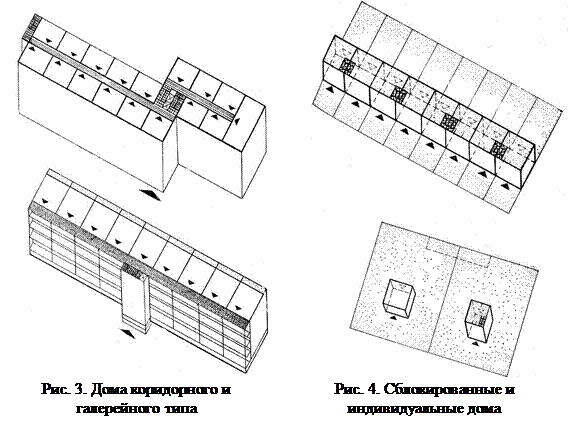 блокировочные дома (как правило, двухэтажные, состоят из квартир, расположенных в двух этажах, со входами с улицы, каждая квартира может иметь небольшой участок земли шириной, равной ширине квартиры (6-8 м), и площадью 150-200 м2), рис. 4; - одноквартирные или двухквартирные жилые дома (могут быть с квартирами на 1 этаж или в двух уровнях, причем второй уровень может быть в виде мансарды). Стоимость жилой площади изменяется в зависимости от ширины и длины жилого дома. В узких жилых домах шириной 7-8 м, часто встречающихся в зарубежной практике, удобно размещаются квартиры со сквозным проветриванием. Но в таких домах неэффективно используется лифт. Увеличение ширины жилого корпуса до 12 м дает возможность увеличить число квартир, выходящих на лестничную площадку одного этажа. Это позволяет снизить стоимость жилой площади. Увеличение числа секций в жилом корпусе повышает эффективность застройки (особенно при увеличении числа секций от 1 до 5). При этом уменьшаются расходы на отопление жилого дома, снижается стоимость СМР и жилой и полезной площади.