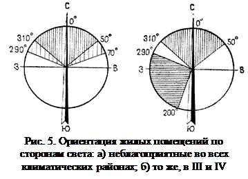 Гигиеническими требованиями установлена необходимость ежедневной непрерывной инсоляции жилых комнат. В период с 22 марта по 22 сентября жилые комнаты должны инсолироваться в течении 2,5 часов. Квартиры, имеющие жилые комнаты с односторонним расположением, не должны иметь окон, ориентированных на сектора (см. рис. 5) горизонта 200° – 290° и 310° – 50°. При двухстороннем расположении комнат допустима ориентация на эти сектора: в двухкомнатных квартирах – одной жилой комнаты, в трех и четырех – двух, в пяти – трех, в общежитиях до 40% комнат. Комнаты ориентированные на сектор 200° – 290° должны иметь регулируемые солнцезащитные устройства.Защита жилищ от шумов. Шумы, в особенности продолжительные и громкие, вредно действуют на нервную систему человека. Проникают в жилища с улиц, дворов, соседних квартир, от работы санитарно-технического оборудования. Уменьшение воздействия шумов до допустимых уровней достигается градостроительными мероприятиями, объемно-планировочными решениями жилищ и зданий в целом, а также созданием требуемых звукоизоляционных свойств ограждающих конструкций (наружных стен, окон, балконных дверей, внутренних стен, перекрытий и перегородок). Противопожарные требования. Противопожарные мероприятия имеют целью предупреждение возникновения пожаров, локализацию очагов возгорания и ограничение возможности распространения огня по зданию, облегчение пожаротушения, сохранения устойчивости конструкций в условиях воздействия на них высоких температур, огня и воды, создание условий для безопасной эвакуации людей из горящих зданий. 3. Принципы объемно-планировочных решений.