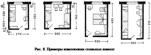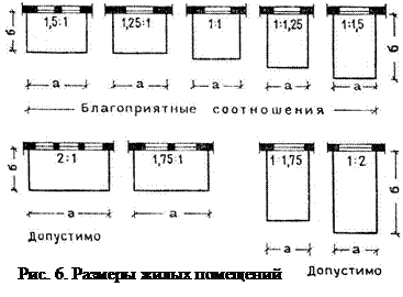 Наиболее удобны жилые комнаты с соотношением ширины и глубины (рис. 6) 1:1; 1:1,25; 1:5; допустимы 1:1,75; менее удобны 1:2.