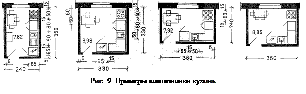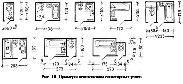 Санитарные узлы (рис. 10) состоят из двух помещений ванной, умывальной и уборной. Передние должны иметь ширину не менее 1,4 м и площадь не менее 3 м2. Хозяйственные кладовые в одно- двухкомнатных квартирах должны быть площадью не менее 1 м2, в трех- пяти-комнатных – не менее 1,5 м2, глубиной 0,8 м. Внутриквартирные коридоры, ведущие к жилым комнатам, должны быть шириной не менее 1,1 м в чистоте, а в другие помещения не менее 0,85м. Высота коридоров должна быть не менее 2м.