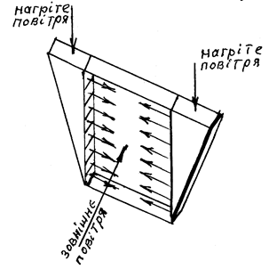 Повітряні завіси, що перешкоджають переохолодженню повітря в середені будівель, виконують таким чином: з бокових сторін дверного прорізу (іноді і під підлогою) розміщуються повітророздаточні пристрої (див.мал.)