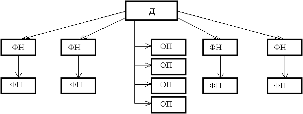 Рисунок 33 – Линейно-функциональная структура управления Д- директор; ФН – функциональные начальники; ФП – функциональные подразделения; ОП – основные подразделения Иногда такую систему называют штабной, так как функциональные руководители соответствующего уровня составляют штаб линейного руководителя (на рисунке 33 функциональные начальники составляют штаб директора). Дивизиональная (филиальная) структура изображена на рисунок 34. Дивизионы (филиалы) выделяются или по области деятельности, или географически.