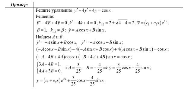 Пример 1. Найти общее решение уравнения Решение. Характеристическое уравнение (6.11) имеет вид Пример 2. Проинтегрировать уравнение Решение. Уравнение (6.11): Пример 3. Найти общее решение уравнения Решение. Характеристическое уравнение Пример 4. Найти частное решение уравнения Решение. Характеристическое уравнение Для определения произвольных постоянных найдем производные: