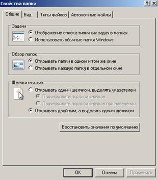 Можно изменить рисунок или темы рабочего стола или разрешение экрана (в пределах возможного для данного типа монитора) или настроить хранитель экрана; для всего этого следует воспользоваться пунктом "Свойства" контекстного меню рабочего стола. Выбрав в оконном меню папки пункт "Сервис>Свойства папки>Общие", можно настроить в данном окне (и в других окнах папок) различные способы открытия папок (рис. 6.3, а). Выбрав в оконном меню папки пункт "Сервис>Свойства папки>Вид", можно настроить выдачу файлов таким образом, чтобы скрывать или, наоборот, отображать зарегистрированные типы файлов (рис. 6.3, б).