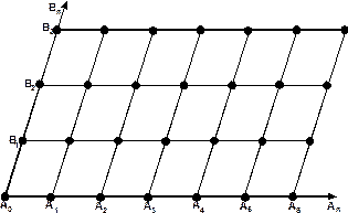 Расстояние между соседними узлами ряда называется промежутком ряда. В нашем случае промежуток ряда равен а. Число узлов, приходящихся на единицу длины ряда, называется плотностью ряда. Очевидно, что плотность ряда обратно пропорциональна величине промежутка: чем меньше промежуток ряда, тем больше будет его плотность. Одно из основных свойств пространственной решётки состоит в том, что через любой узел решётки всегда можно провести ряд, параллельный данному ряду, причём все параллельные ряды имеют одинаковую плотность. Ряды же разных направлений в общем случае обладают различной плотностью. В частных случаях и у непараллельных рядов промежутки могут быть одинаковыми. Возьмём теперь относительно исходного узла А0 ещё один ближний к нему узел, лежащий в плоскости чертежа, но не вне ряда А0Аn. Пусть это будет узел В1, отстоящий от узла А0 на расстояние b (рис. 1.2). Соединив узлы А0 и В1 прямой линией и продолжив её дальше, получим новый ряд А0Вn с промежутком ряда b. Два пересекающихся ряда А0Аn и А0Вn, определяют положение плоскости, которая пройдёт через бесконечное множество узлов пространственной решётки. Совокупность узлов пространственной решётки, лежащих в одной плоскости, называется плоской сеткой. Узлы всякой плоской сетки можно расположить в вершинах равных и параллельных друг другу параллелограммов, смежных по целым сторонам. Такую систему параллелограммов в нашем случае получим, если через узлы В1, В2,..., Вn проведём ряды, параллельные ряду А0Аn, а через узлы А2.,А3,А4,...,Аn, - ряды, параллельные ряду А0Вn (см. рис. 2). Число узлов, приходящихся на единицу площади плоской сетки, называется её ретикулярной плотностью. Согласно второму основному свойству пространственной решётки через любой узел решётки можно провести плоскую сетку, параллельную данной и имеющую такую же ретикулярную плотность. Таким образом в решётке параллельно каждой плоской сетке проходит бесконечное множество тождественных плоских сеток. Совокупность параллельных друг другу плоских сеток пространственной решётки будем называть серией плоских сеток. Расстояние между двумя ближайшими параллельными плоскими сетками называется межплоскостным расстоянием.