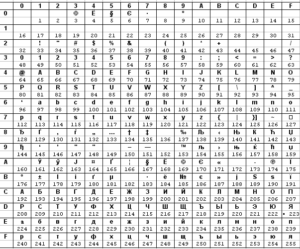 Для кодирования текстовых данных в ЭВМ используется специальный метод, согласно которому, каждому символу алфавита сопоставлено число. Эти соответствия сведены в специальные таблицы, называемые стандартами кодирования текстовых данных. При кодировании текста, каждый символ алфавита заменяется соответствующим ему числом. При раскодировании, наоборот числа заменяются соответствующими им символами. Для того чтобы не ошибиться при декодировании данных, числа, представляющие текст, разделены на зоны. Каждая зона имеет длину 1 байт (8 двоичных разрядов). В настоящее время очень широкое распространение получил стандарт, называемый ASKII (American Standard Code for Information Interchange - стандартный код информационного обмена США). Этот стандарт имеет две части таблицы базовую – содержащую символы математических операций, латиницы, знаки препинания и др. и расширенную, содержащую символы национальных языков. Базовая часть всегда неизменна и использует для кодирования символов шестнадцатеричные коды 00 – 7F. Расширенная часть таблицы (коды 80 – FF) может использоваться разная. Таблица ASCII-кодов используемая в России приведена на рисунке 5.