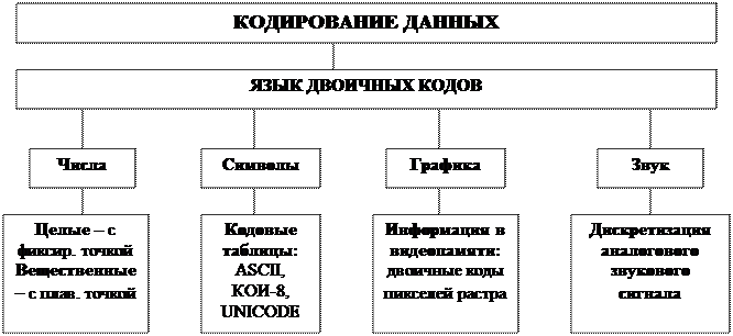 Для автоматизации работы с данными, относящимися к различным типам, очень важно унифицировать их форму представления – для этого обычно используется прием кодирования, т.е. выражение данных одного типа через данные другого типа. Примеры: ваша запись в тетради - кодирование информации с помощью специальных символов; естественные человеческие языки - системы кодирования понятий для выражения мыслей посредством речи; азбуки – системы кодирования компонентов языка посредством графических символов.
