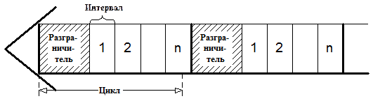 Метод с передачей маркера – это метод доступа к среде, в котором от рабочей станции к рабочей станции передается маркер, дающий разрешение на передачу сообщения. При получении маркера рабочая станция может передавать сообщение, присоединяя его к маркеру, который переносит это сообщение по сети. Каждая станция между передающей станцией и принимающей видит это сообщение, но только станция – адресат принимает его. При этом она создает новый маркер. Маркер (token), или полномочие, – уникальная комбинация битов, позволяющая начать передачу данных. Каждый узел принимает пакет от предыдущего, восстанавливает уровни сигналов до номинального уровня и передает дальше. Передаваемый пакет может содержать данные или являться маркером. Когда рабочей станции необходимо передать пакет, ее адаптер дожидается поступления маркера, а затем преобразует его в пакет, содержащий данные, отформатированные по протоколу соответствующего уровня, и передает результат далее по ЛВС. Пакет распространяется по ЛВС от адаптера к адаптеру, пока не найдет своего адресата, который установит в нем определенные биты для подтверждения того, что данные достигли адресата, и ретранслирует его вновь в ЛВС. После чего пакет возвращается в узел из которого был отправлен. Здесь после проверки безошибочной передачи пакета, узел освобождает ЛВС, выпуская новый маркер. Таким образом, в ЛВС с передачей маркера невозможны коллизии (конфликты). Метод с передачей маркера в основном используется в кольцевой топологии. Данный метод характеризуется следующими достоинствами: - гарантирует определенное время доставки блоков данных в сети; - дает возможность предоставления различных приоритетов передачи данных. Вместе с тем он имеет существенные недостатки: - в сети возможны потеря маркера, а также появление нескольких маркеров, при этом сеть прекращает работу; - включение новой рабочей станции и отключение связаны с изменением адресов всей системы. Множественный доступ с разделением во времени основан на распределении времени работы канала между системами (рис.4.7). Доступ TDMA основан на использовании специального устройства, называемого тактовым генератором. Этот генератор делит время канала на повторяющиеся циклы. Каждый из циклов начинается сигналом Разграничителем. Цикл включает n пронумерованных временных интервалов, называемых ячейками. Интервалы предоставляются для загрузки в них блоков данных.