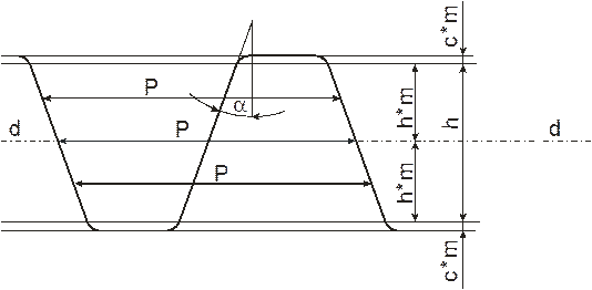 Рис. 22 d-d – делительная прямая; α – угол исходного контура, α=20°; C* – коэффициент радиального зазора, C* =0,25; h* – коэффициент высоты зуба, h* =1,0; p – шаг зацепления, p. =.const.