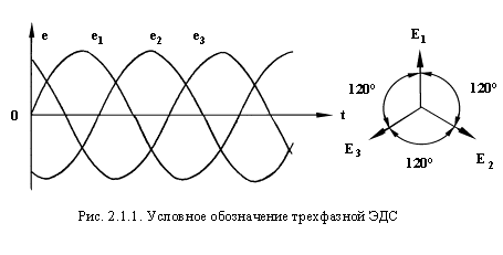 Графически ЭДС можно изобразить тремя синусоидами, сдвинутыми на 1/3 периода, или тремя векторами, находящимися под углом 120° друг к другу.