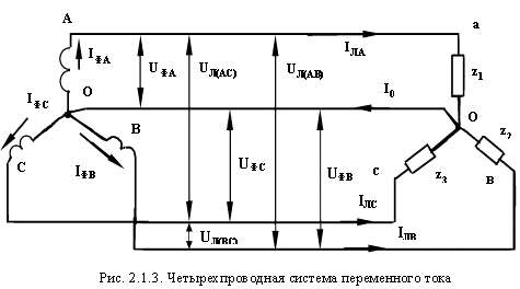 При симметричной нагрузке нулевой провод практически не нужен, т.к. ток Io в нем равен нулю. Поэтому, в этих случаях применяют трехпроводные системы. При несимметричной трехфазной нагрузке нулевой провод обеспечивает постоянство напряжений на фазах.